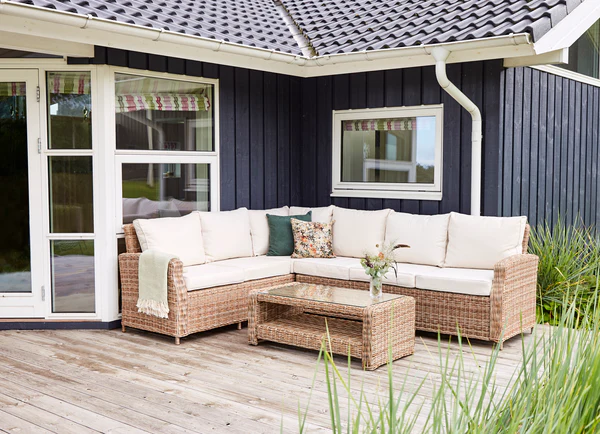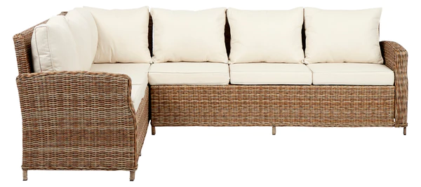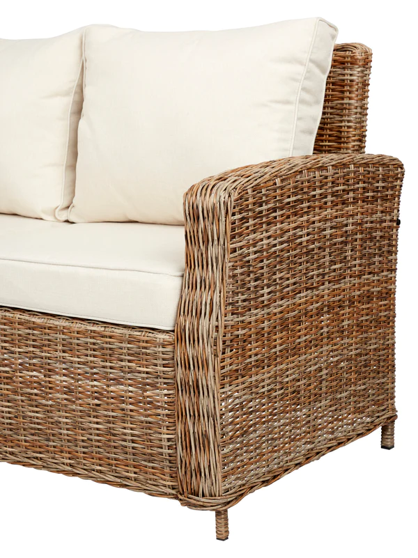 Šis milzīgais stūra dīvāns ir lieliski piemērots lielām terasēm. Tajā ir ļoti labi sēdēt un skaisti skatīties. Tas ir izgatavots no materiāliem, kuriem nav nepieciešama apkope. Karkass ir izgatavots no alumīnija, kas nodrošina labu pamatni un stabilu dīvānu. Pēc tam alumīnijs tiek pārklāts ar polirotangpalmu, kas ir lielisks materiāls āra mēbelēm, pateicoties tā dabiskajam izskatam, kas joprojām ir izturīgs pret pelējumu un mitrumu. Spilveni ir izgatavoti no poliestera ar gandrīz baltu audekla izskatu, kas nodrošina neapstrādātu un dabisku stilu, vienlaikus ir mīksti un patīkami sēdēt. Tas patiešām var piešķirt jūsu terasei ekskluzīvu sajūtu. Izmērs ar abām sekcijām: 205 x 74 x 85 cm. Sēdekļa augstums: 37 cm, sēdekļa dziļums:; 60 cm.