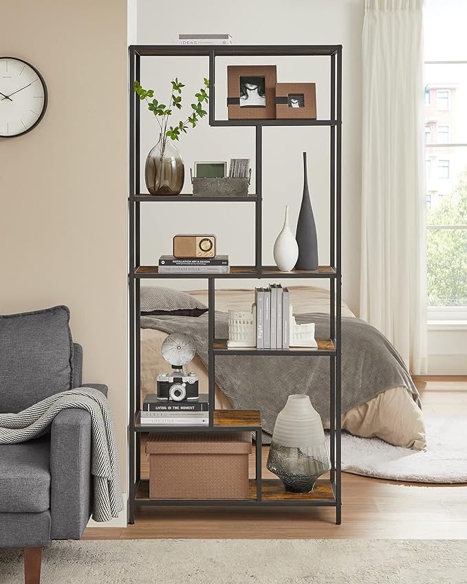 Grāmatu skapis, 6 līmeņu grāmatu skapis, ģeometrisks displeja plaukts, stāvošs uzglabāšanas plaukts, 30 x 80 x 180 cm, darba kabinetam, birojam, viesistabai, guļamistabai, virtuvei, zemniecisks brūns un melns.