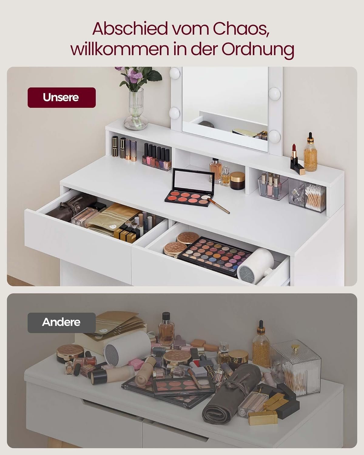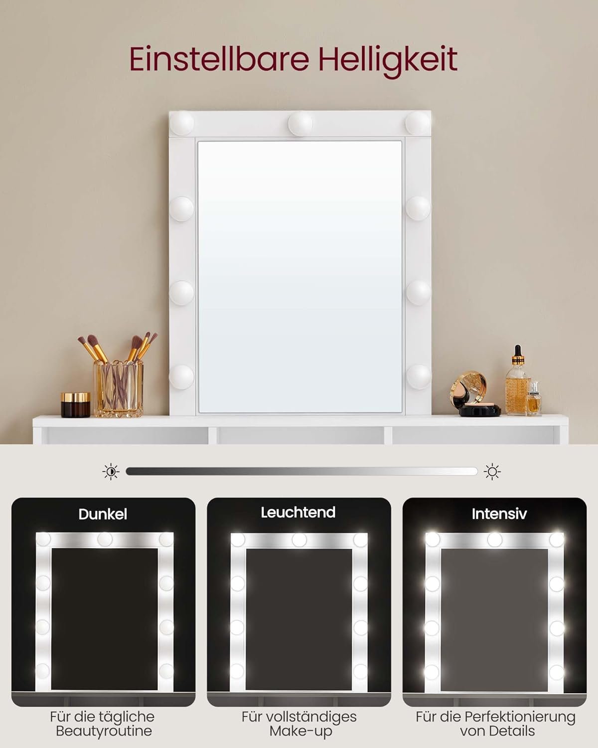 Regulējams spilgtums: 9 spuldzes (ilgi nospiediet slēdzi, lai regulētu apgaismojumu) atbilst dažādām spilgtuma prasībām perfektam grimam.