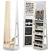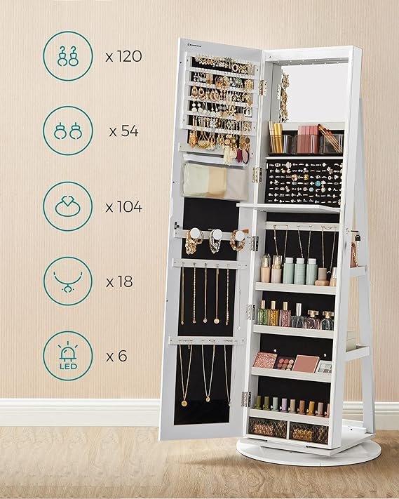 Spoguļskapis, Stāvs spogulis, Juvelierizstrādājumu skapis ar spoguli, LED iekšējais apgaismojums, ar bezrāmju pilna garuma spoguli, 3 plaukti, 360° grozāms, slēdzams, balts