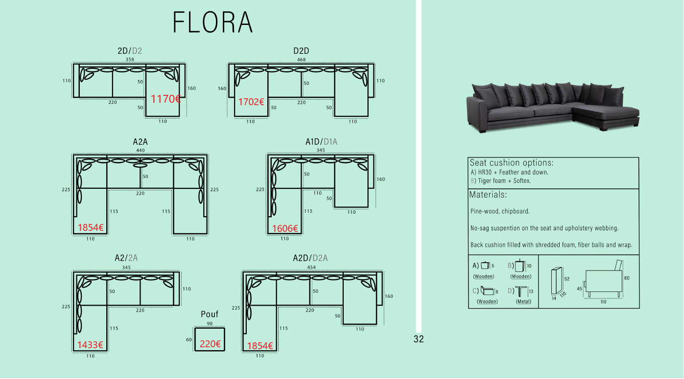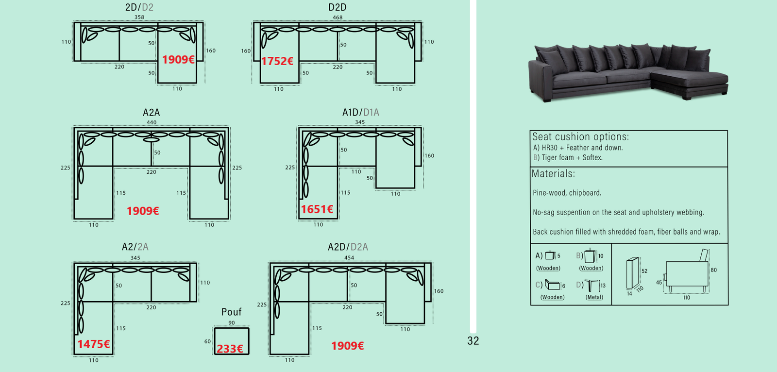 Stūra dīvāna cena ir atkarīga no izmēra. Izmēri un cenas atrodamas bildēs