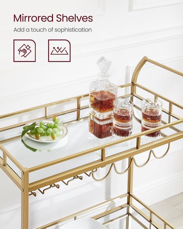 Zelta stieņu grozs, mājas bāra servēšanas grozs, vīna ratiņi ar 2 spoguļattēlu plauktiem, vīna turētāji, glāžu turētāji, virtuvei, ēdamistabai, zelts.